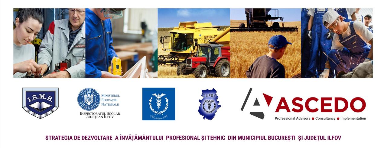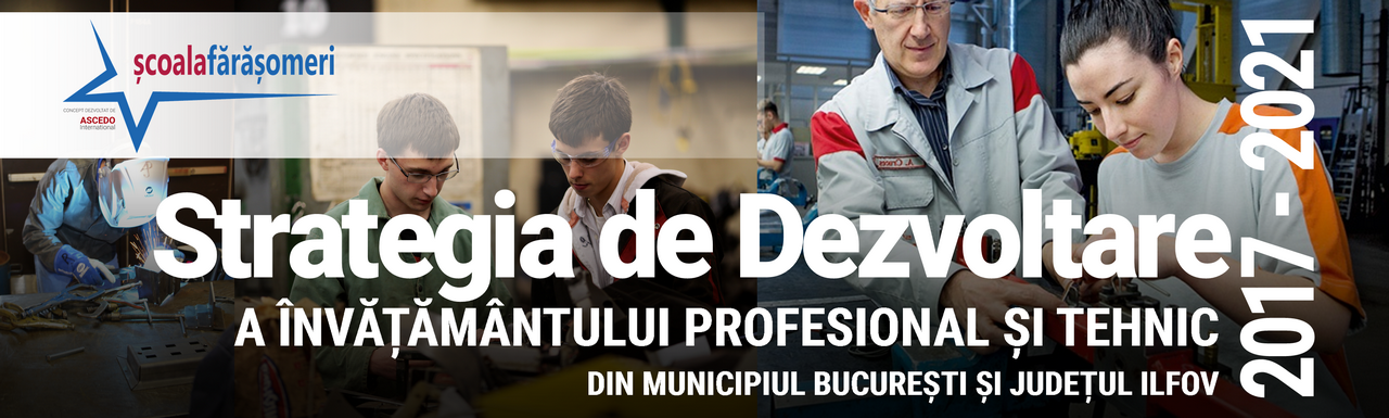 ******************************************************************************************************************** Strategia își propune dezvoltarea Învățământului Profesional și Tehnic din Municipiul București și Județul Ilfov prin identificarea de necesități și direcții de acțiune conform cu cerințele pieții pentru a pune bazele dezvoltării socio - economice. În fundamentarea scopului proiectului au stat la bază abordarea unitară a învăţământului profesional și tehnic din Muncipiul Bucureşti şi județul Ilfov raportat la agenţii economici care sunt concentraţi cu precădere în judeţul Ilfov, pe cale de consecinţă, strategia îşi propune prin auditul situaţiei existente dar şi prin analiză SWOT, stabilirea unor direcţii strategice menite să reducă discrepanța între direcţiile de formare profesională şi necesităţile pieţei. Din datele diseminate în studiile anterioare apare necesitatea de forţă de muncă calificată conform cerinţelor actuale iar strategia îşi propune identificarea de mecanisme reale în ocuparea locurilor de muncă actuale cât şi inserţia absolvenţilor pe piaţă muncii și generarea de noi locuri de muncă. OBIECTIVELE STRATEGIEI Strategia îşi propune prin auditul situaţiei existente şi prin analiză SWOT, stabilirea unor direcţii strategice menite să reducă discrepanța între direcţiile de formare profesională şi necesităţile pieţei. Realizarea unei radiografii a stadiului de dezvoltare a învățământului profesional și tehnic și a gradului de maturitate a parteneriatelor public-private. Crearea unor instrumente de lucru la nivel regional care să consolideze parteneriatele public-private și să faciliteze inserția pe piața muncii a absolvenților de învățământ profesional și tehnic dar și să monitorizeze gradul de angajabilitate al absolvenților. Elaborarea unor strategii de analiză a performaței (Benchmarking, Balanced Scorecard (BSC) și Indicatori de performanță (KPI)) la nivel strategic, managerial și operațional, pentru măsurarea planificării în învățământul profesional și tehnic (Plan Managerial și Plan Operațional). Identificarea comenzii sociale pentru învăţământul profesional şi tehnic și a domeniilor prioritare pentru formarea profesională iniţială și continuă de la nivelul regiunii București-Ilfov; |